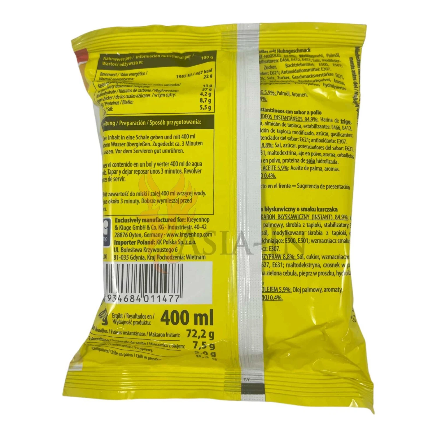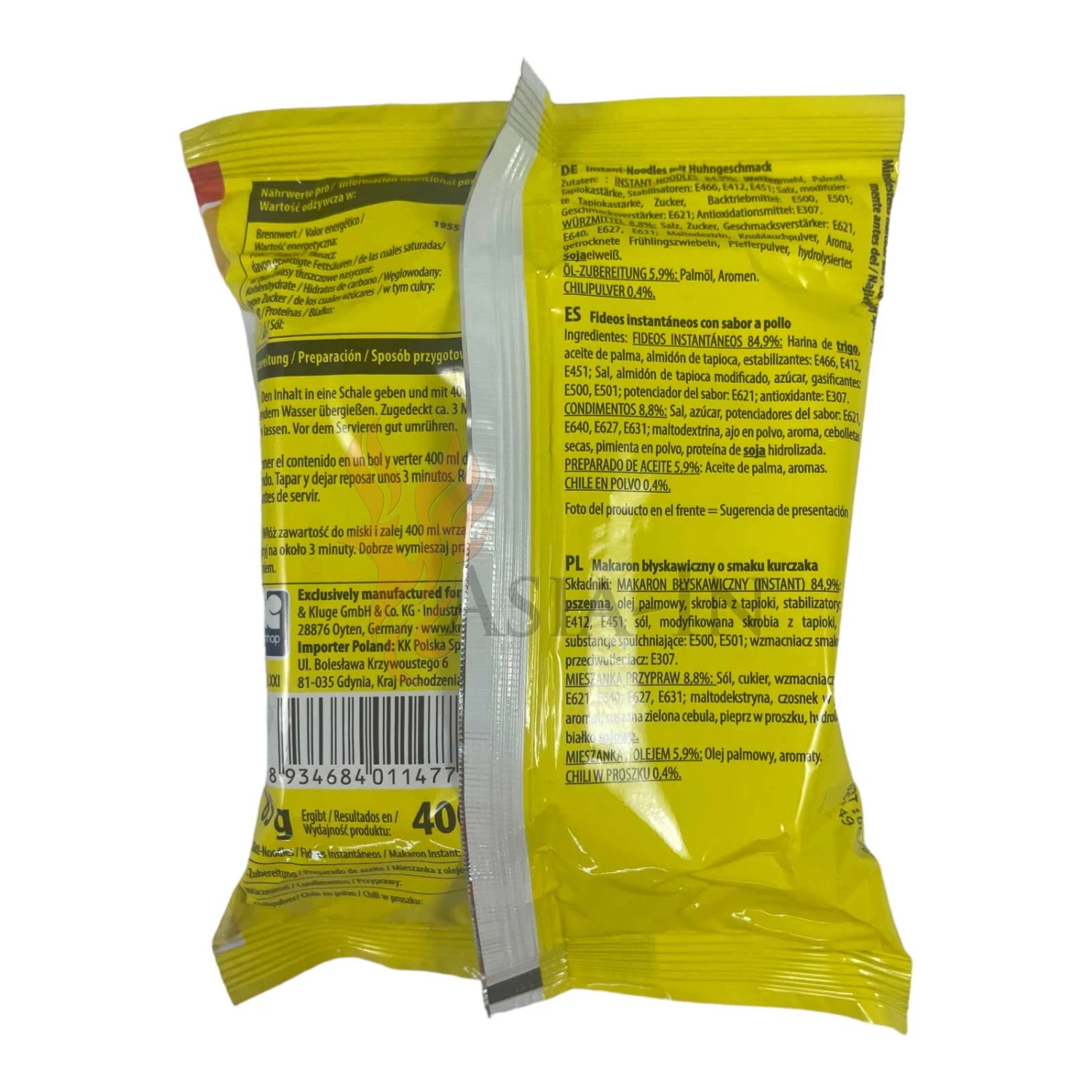 | Zutaten: | Nudeln: Weizenmehl, 54%, Modifizierte Tapiokastärke, Palmöl, Salz Würzmischung: Salz, Pfefferpulver, Knoblauchpulver, Zucker, Aroma, getrocknete Frühlingszwiebeln, Geschmacksverstärker: Mononatriumglutamat E621, Geschmacksverstärker: Dinatriumguanylat E627, Geschmacksverstärker: Dinatriuminosinat E631 Öl: Palmöl, Aroma Gemüse: Weisskohl, Karotten, Frühlingszwiebeln, Chilipulver, 0,4% |