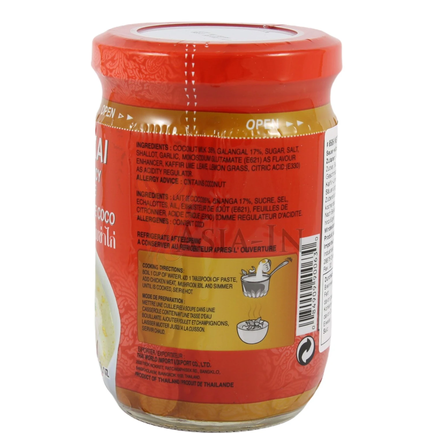 | Zutaten: | Kokosnussextrakt 35%, Galgant (Thai Ingwer), Zucker, Salz, Schalotten, Knoblauch, Geschmacksverstärker: Mononatriumglutamat E621, Kaffir-Limettenblätter, Zitronengras, Säuerungsmittel: Citronensäure E330 |