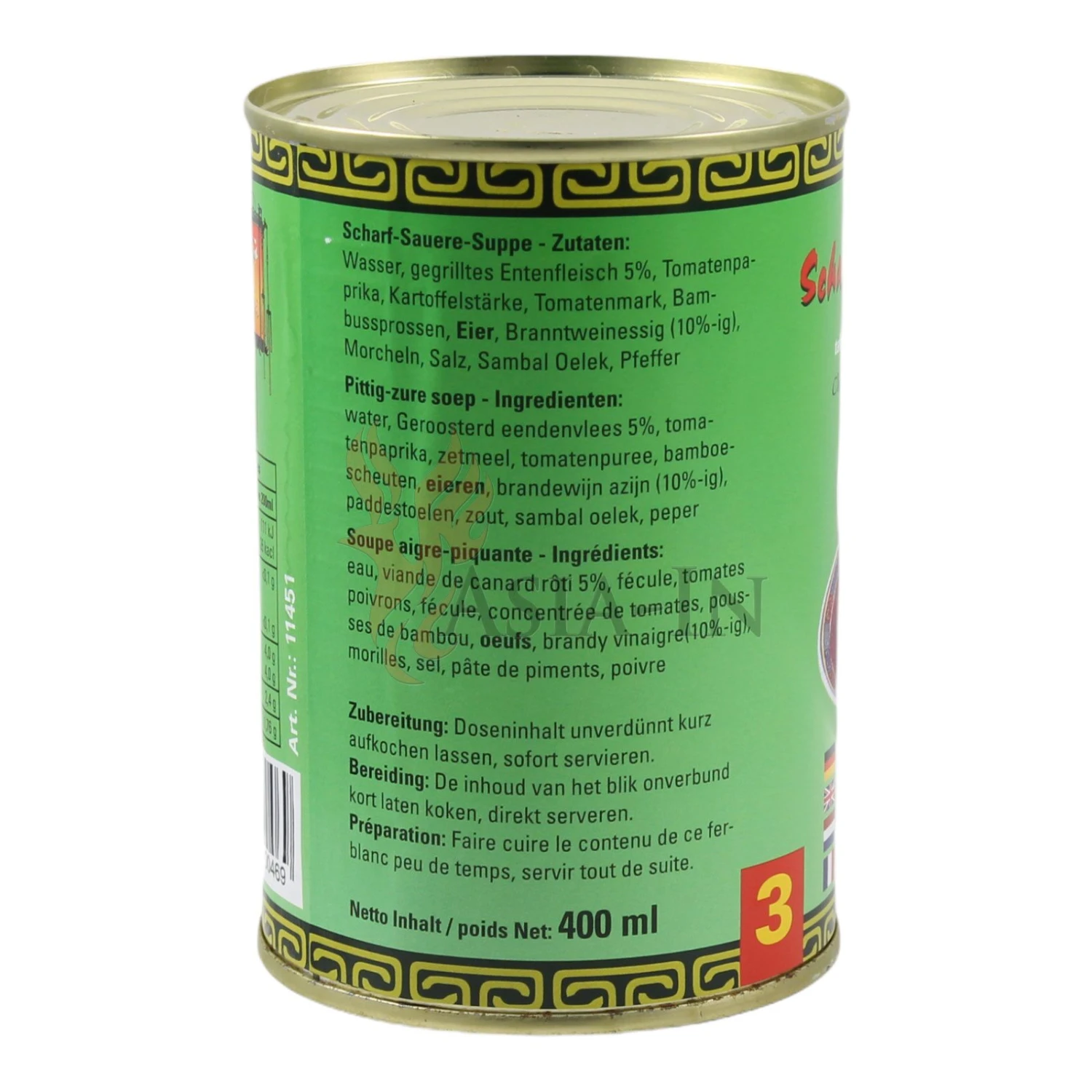 | Zutaten: | Wasser, gegrilltes Entenfleisch, 5%, Tomatenpaprika, Kartoffelstärke, Tomatenmark, Bambussprossen, Eier, Branntweinessig, Morcheln, Salz, Sambal Oelek, Pfeffer |