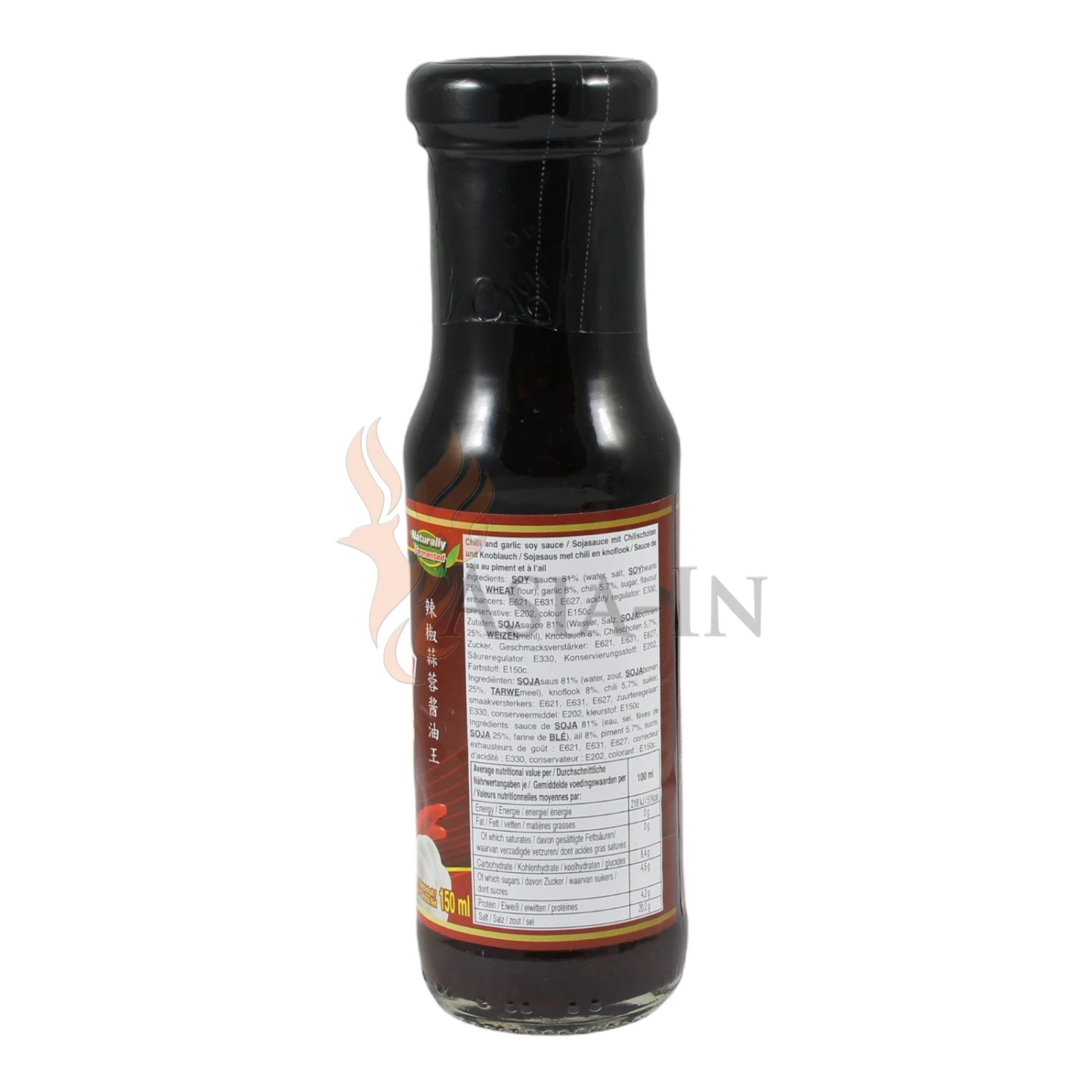 | Zutaten: | Sojasauce 81% (Wasser, Salz, Sojabohnen, 25%, Weizenmehl), Knoblauch, 8%, Chilischoten, 5,7%, Zucker, Geschmacksverstärker: Mononatriumglutamat E621, Geschmacksverstärker: Dinatriuminosinat E631, Geschmacksverstärker: Dinatriumguanylat E627, Säuerungsmittel: Citronensäure E330, Konservierungsstoff: Kaliumsorbat E202, Farbstoff: Ammoniak-Zuckerkulör E150c |