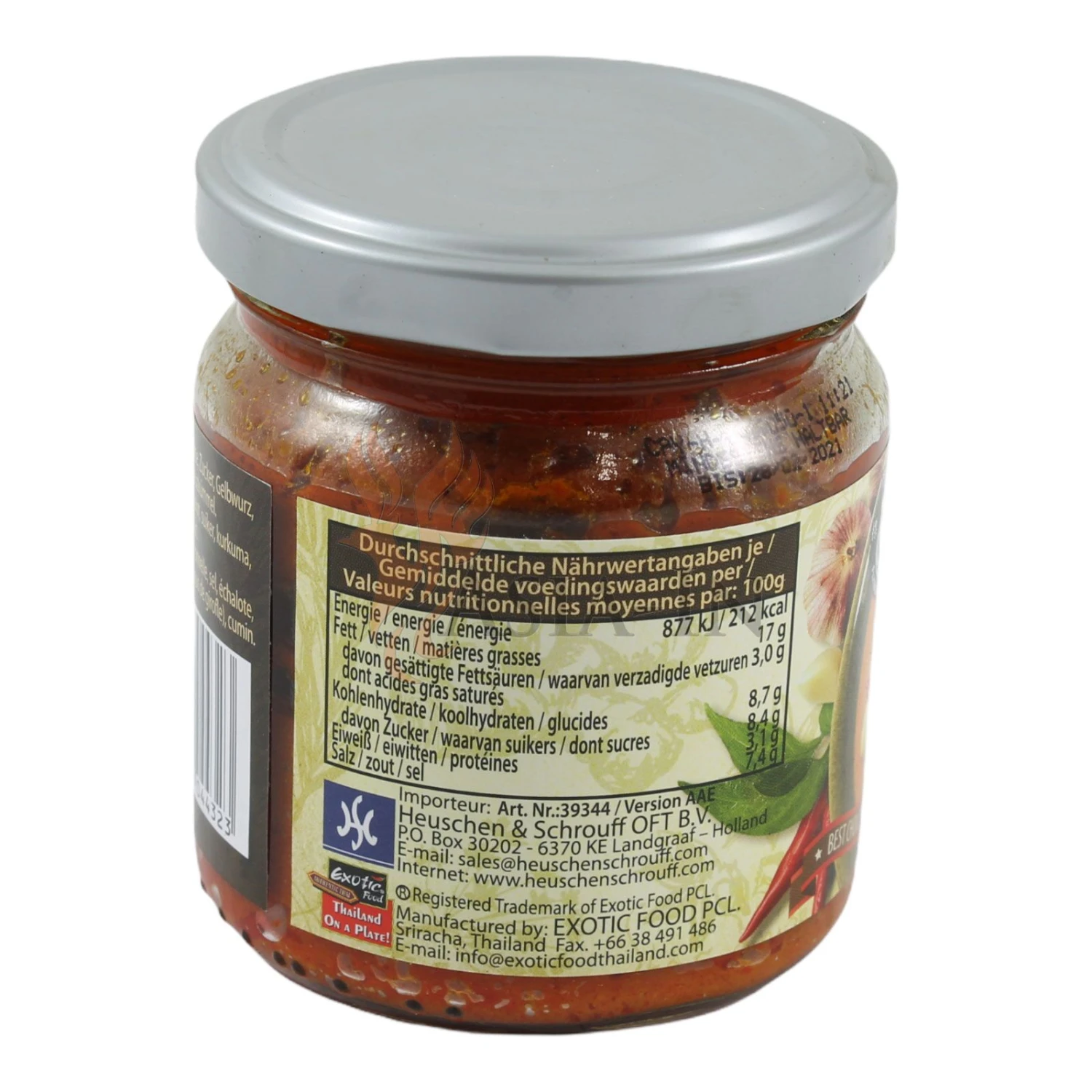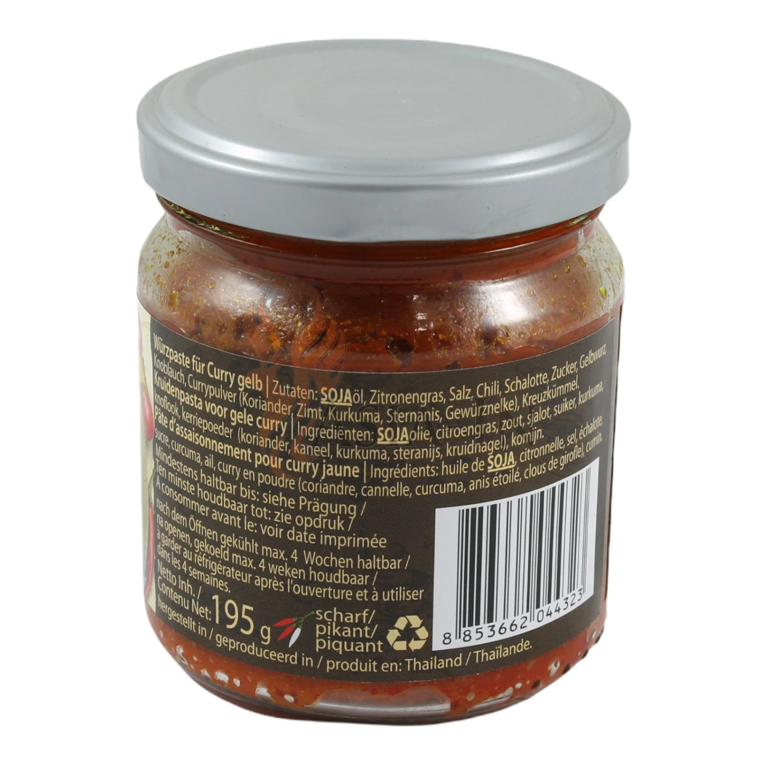| Zutaten: | Sojaöl, Zitronengras, Salz, Chili, Schalotten, Zucker, Gelbwurz, Knoblauch, Currypulver (Koriander, Zimt, Kurkuma, Sternanis, Gewürznelken), Kreuzkümmel |