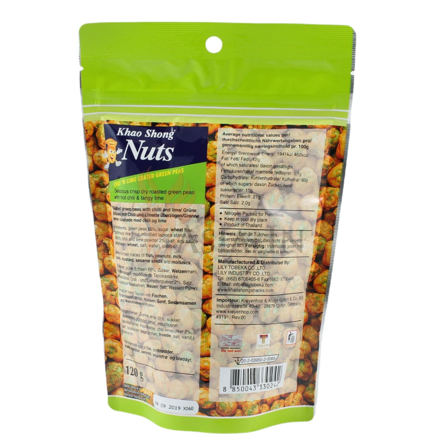 | Zutaten: | grüne Erbsen, 65%, Zucker, Weizenmehl, Klebreismehl, Modifizierte Tapiokastärke, Maisstärke, Chili -und Limettenpulver, 2%, Salz, Sojasauce (Sojabohnen, Weizen, Salz, Wasser), Palmöl |