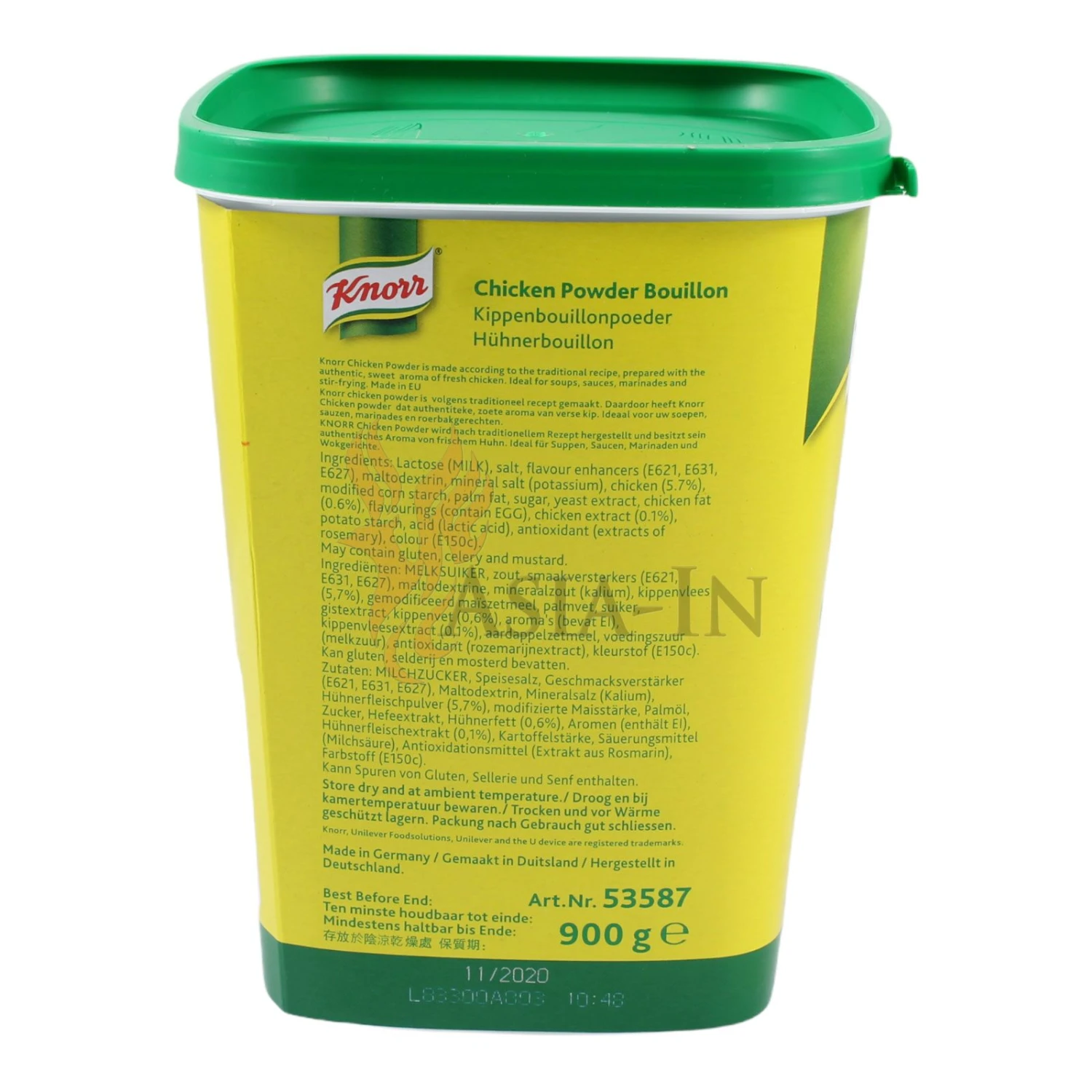 | Zutaten: | Milchzucker, Speisesalz, Geschmacksverstärker: Mononatriumglutamat E621, Geschmacksverstärker: Dinatriuminosinat E631, Geschmacksverstärker: Dinatriumguanylat E627, Maltodextrin, Mineralsalz (Kalium), Hühnerfleischpulver, 5,7%, Modifizierte Maisstärke, Palmöl, Zucker, Hefeextrakt, Hühnerfett, 0,6%, Aromen (enthält Ei), Hühnerfleischextrakt, 0,1%, Kartoffelstärke (Säuerungsmittel: Milchsäure E270), Antioxidationsmittel, aus rosmarin), Farbstoff: Ammoniak-Zuckerkulör E150c |