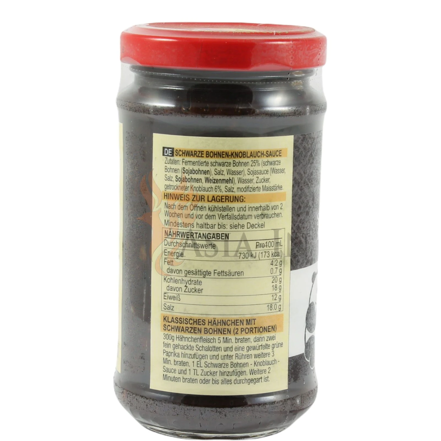 | Zutaten: | fermentierte Schwarze, Bohnen, 25% (Schwarze, Bohnen (Sojabohnen), Salz, Wasser), Sojasauce (Wasser, Salz, Sojabohnen, Weizenmehl), Wasser, Zucker, getrockneter Knoblauch, 6%, Salz, Modifizierte Maisstärke |