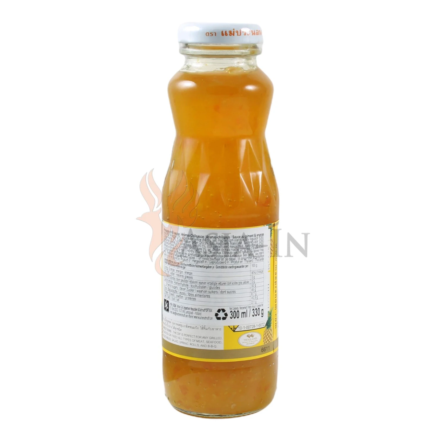 Wir von asia-in.de liefern die Ananas Chili Sauce in einer schönen Glasflasche mit einem attraktiven Label. Hersteller Mae Pranom, ein sehr großer Nahrungsmittelproduzent in Asien, produziert ausschließlich unter höchsten Qualitätsstandards. Das gilt auch für Zutaten, im Wesentlichen: Zucker 35%, Ananas 25%, Wasser 25%, 5% gelben Chili, Essig 5%, Salz 4%.<?xml:namespace prefix=“o“ ns=“urn:schemas-microsoft-com:office:office“ />