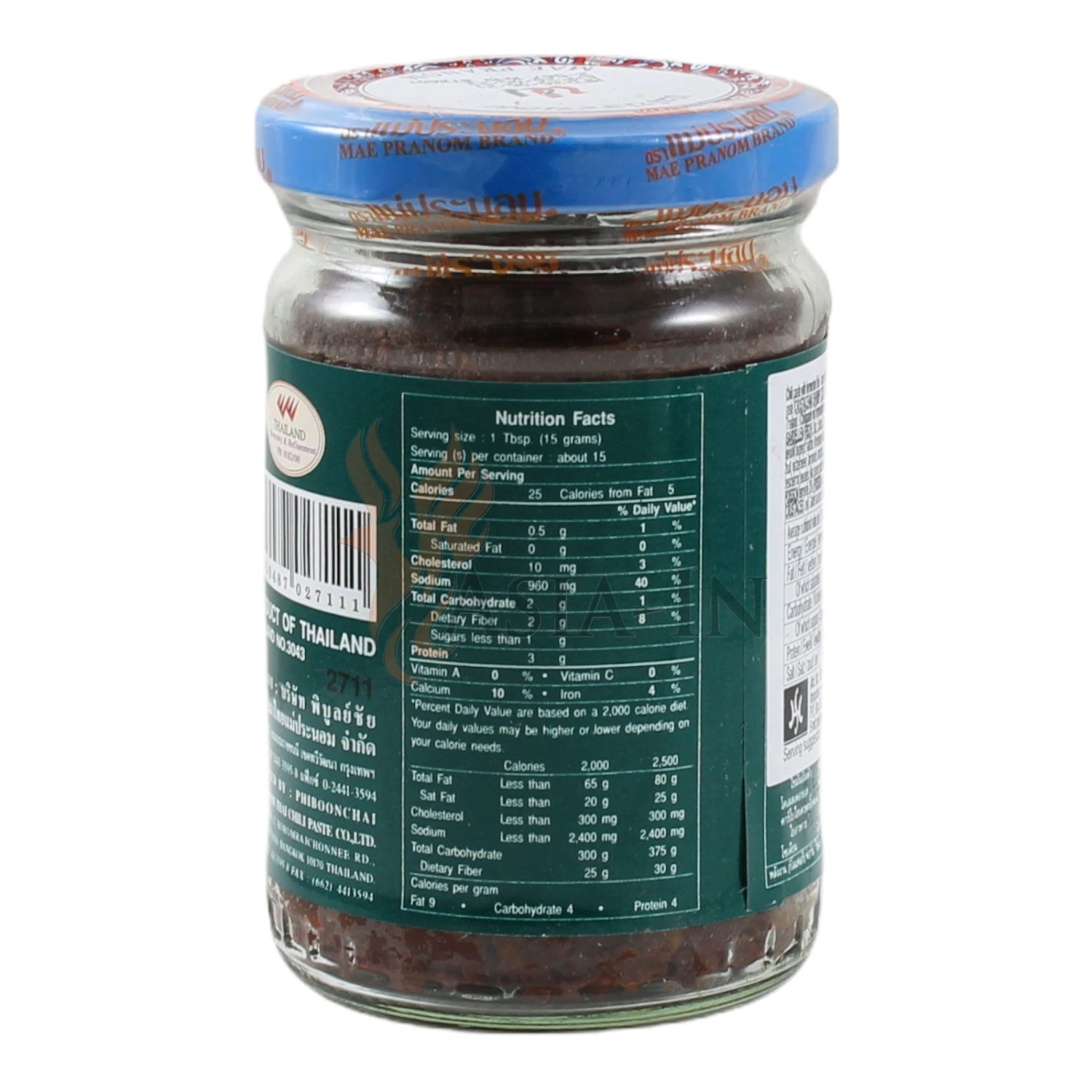 | Zutaten: | getrocknete Chilischoten, 20%, fermentierter Fisch, 20% (Fisch, Salz, Reiskleie), Tamarinden, Knoblauch, Zwiebeln, Fischsauce (Sardellen, Salz, Zucker), Zucker, Salz, Garnelenpaste (Garnelen, Salz), |