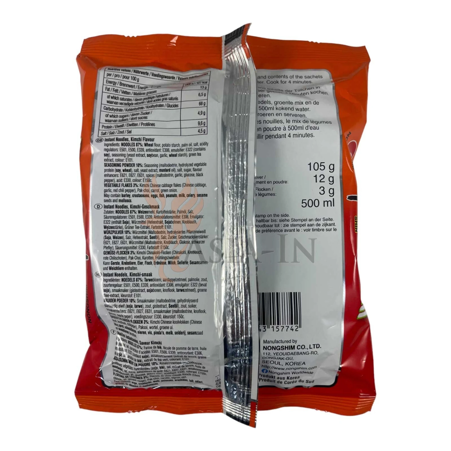 | Zutaten: | Nudeln: Weizenmehl (USA), Kartoffelstärke, Palmöl, Salz, Säuerungsmittel: Kaliumcarbonate E501, Säuerungsmittel: Natriumcarbonate E500, Säureregulator: Natriumphosphat E339, Tocopherol Flüssigkeit (Antioxidationsmittel: Tocopherol E306, Emulgator: Lecithin E322 (enhält Soja) (enthält Soja), ), Würzmittel (Hefeextrakt, Sojasauce, Knoblauch, Weizenstärke), Grünteeextrakt (Oligosaccharides, Tee-Catechin), Farbstoff: Riboflavin E101 Suppenpulver: Würzmittel (Maltodextrin, hydrolisiertes Pflanzeneiweiß (Soja, Weizen), Salz, Hefeextrakt, Senföl), Salz, Zucker, Würzmittel (Maltodextrin, Knoblauch, Glucose, schwarzer Pfeffer), Geschmacksverstärker: Dinatriuminosinat E631, Geschmacksverstärker: Dinatriumguanylat E627, Säuerungsmittel: Citronensäure E330, Verdickungsmittel: Guarkernmehl E412, Karamellpulver (Maltodextrin, Farbstoff: Ammoniak-Zuckerkulör E150c) Flocken: Kimchi Flocken, 1% (Chinakohl, Knoblauch), Pak Choi, Karotten, Zwiebeln |