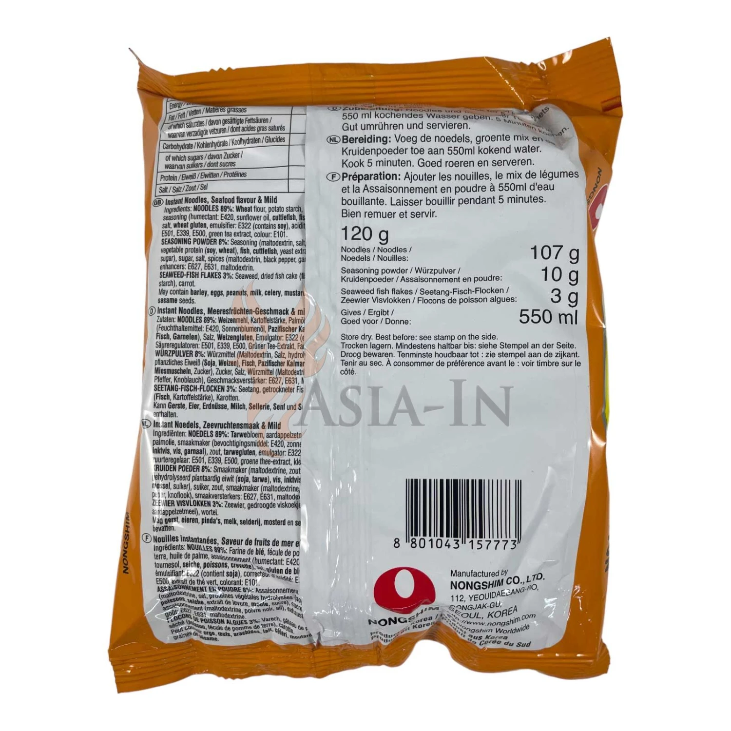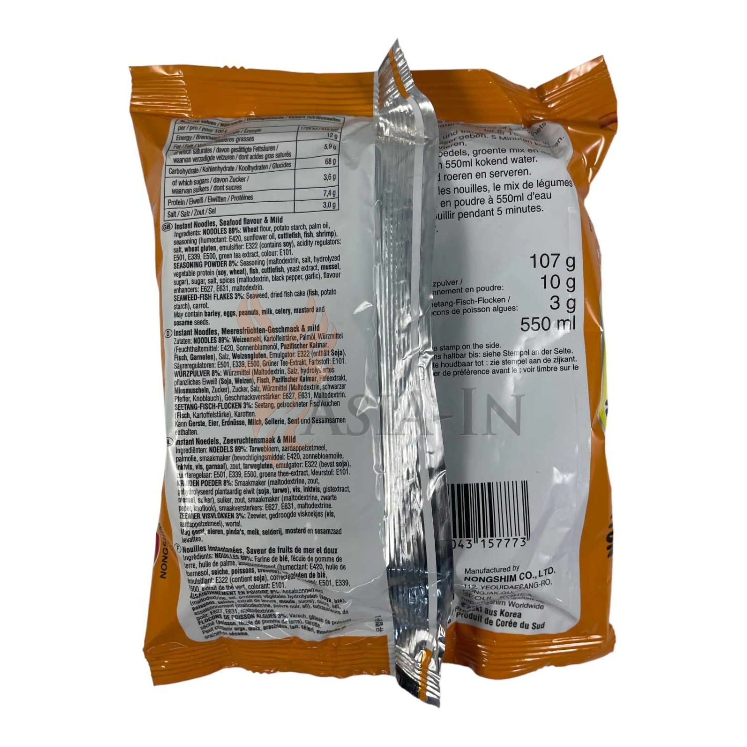 | Zutaten: | Nudeln: Weizenmehl (Australien), Kartoffelstärke, Palmöl, Würzmittel (Reisöl, Zucker, Tintenfisch, Sardellen, Emulgator: Lecithin E322 (enhält Soja) (enthält Soja), Garnelen, Fischsauce (Thunfisch, Meerbrassen), ), Salz, Tocopherol Flüssigkeit (Antioxidationsmittel: Tocopherol E306, Emulgator: Lecithin E322 (enhält Soja) (enthält Soja), ), Säuerungsmittel: Kaliumcarbonate E501, Säureregulator: Natriumphosphat E339, Säuerungsmittel: Natriumcarbonate E500, Grüner Tee Extrakt (Oligosaccharides, Tee-Catechin, Säuerungsmittel: Citronensäure E330), Farbstoff: Riboflavin E101 Suppenpulver: Würzmittel (Maltodextrin, hydrolisiertes pflanzliches Eiweiß (Soja), Salz, Thunfisch, Zucker, Hefeextrakt, Weizenstärke, Sardellen, Tintenfisch, Dorsch, Venusmuscheln, Bonito, Garnelen), ), Salz, Zucker, Würzmittel (Maltodextrin, Chilischoten, schwarzer Pfeffer, Knoblauch), Geschmacksverstärker: Dinatriuminosinat E631, Geschmacksverstärker: Dinatriumguanylat E627, Karamellpulver (Maltodextrin, Farbstoff: Ammoniak-Zuckerkulör E150c), Trennmittel: Siliciumdioxid E551 Flocken: Seetang, Fischkuchen (Seelachs, Mais, Glucose), Karotten |
