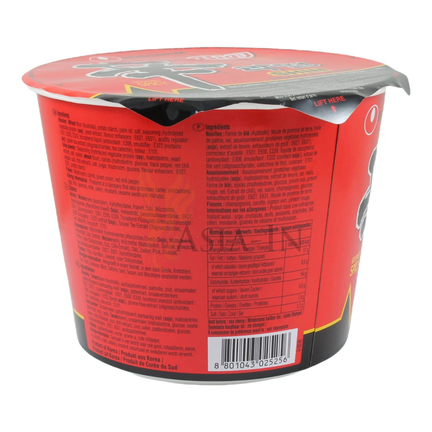 | Zutaten: | Nudeln: Weizenmehl (Australien), Kartoffelstärke, Palmöl, Salz, Würzmittel (hydrolisiertes pflanzliches Eiweiß (Soja), Hefeextrakt, Geschmacksverstärker: Dinatriumguanylat E627, Geschmacksverstärker: Dinatriuminosinat E631), Säuerungsmittel: Kaliumcarbonate E501, Säuerungsmittel: Natriumcarbonate E500, Säureregulator: Natriumphosphat E339, Tocopherol Flüssigkeit (Antioxidationsmittel: Tocopherol E306, Emulgator: Lecithin E322 (enhält Soja) (enthält Soja), ), Grüner Tee Extrakt (Oligosaccharides, Tee-Catechin), Farbstoff: Riboflavin E101 Suppenpulver: Würzmittel (hydrolisiertes pflanzliches Eiweiß (enthält Soja), Maltodextrin, Hefeextrakt, Salz, Rettich, Weizenmehl), Würzmittel (Maltodextrin, Glucose, schwarzer Pfeffer, rote Chilischoten, Salz, Chiliextrakt), Salz, Zucker, Pilze, Glucose, Geschmacksverstärker: Dinatriumguanylat E627, Geschmacksverstärker: Dinatriuminosinat E631, Kartoffelstärke Flocken: Pilze, Karotten, Zwiebeln, rote Chilischoten |