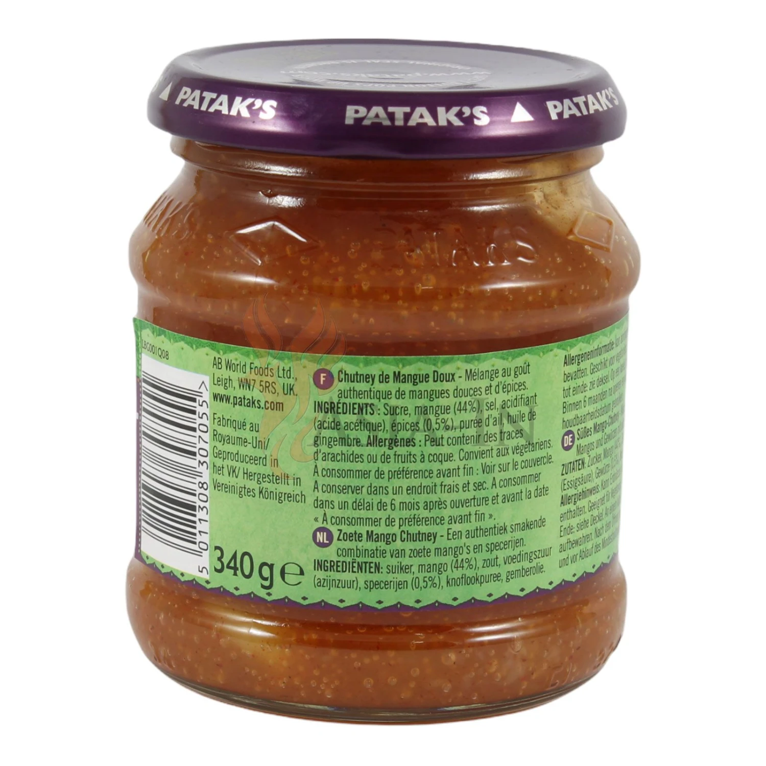 | Zutaten: | Zucker, Mango, 44%, Salz, Säuerungsmittel: Essigsäure E260, Gewürze, 0,5%, Knoblauchpüree, Ingweröl |